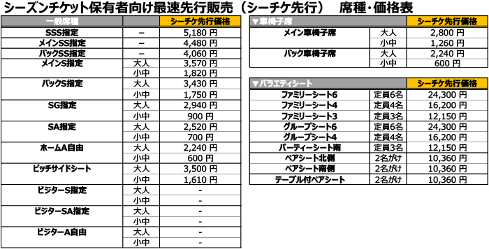 ※上記販売期間内の特別販売価格となります。販売期間を過ぎると上記価格で購入できません。また、同期間から始まるプレミアムプラン超最速先行販売やシーチケ先行後に始まる後援会会員先行販売以降はダイナミックプライシングによる販売を行うため、こちらの特別価格より価格が下がる可能性もございますのであらかじめご了承ください。