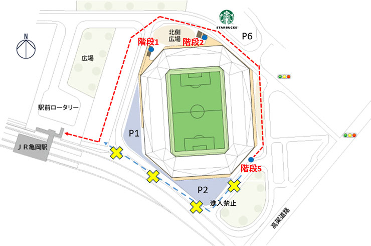 ◇スタジアム周辺の歩行者導線につきましては、下図の通りスタジアム南側の通行はお控えくださいますようご協力をお願いいたします。