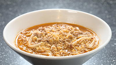 | 商品に関して | 鍋に本品1個と水250ミリリットル、豚ひき肉とうどんを加えて煮込み、仕上げに溶き卵を入れて完成します。「ニュータンタンメン」の味わいを再現するため、たっぷりのニンニクと香り高い唐辛子を使用することで、煮込む際に立ち上がる香りや食べたときのパンチのある味わいを目指しました。また、元祖ニュータンタンメン本舗では自社製麺を使用していますが、「プチッとうどん」はうどんで食べる調理法のため、うどんに合う味わいを追求し、麺にからむよう濃厚な味わいに仕上げました。(麺・具材は別途ご用意ください) |