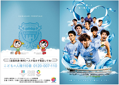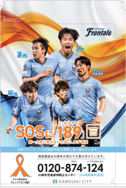 | 内容 | 川崎フロンターレでは、少しでも多くの方に関心を持っていただき、市民の皆さんと子ども虐待を減らしていくことを目的とし、川崎市による児童虐待防止の啓発活動に協力いたします。
