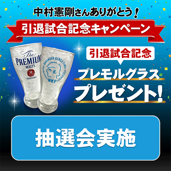 おとなサントリーのLINE友だちに登録をいただいた方を対象に抽選会を実施いたします。抽選で300名様に引退試合記念オリジナルプレミアムモルツタンブラー(150ml)をプレゼントいたします。