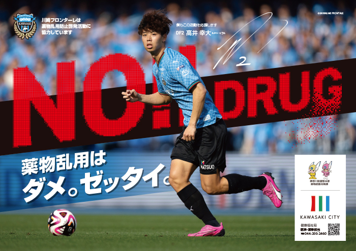 この度、川崎市健康福祉局が制作する薬物乱用防止啓発ポスターに、当クラブの高井幸大選手が採用されましたので、お知らせいたします。