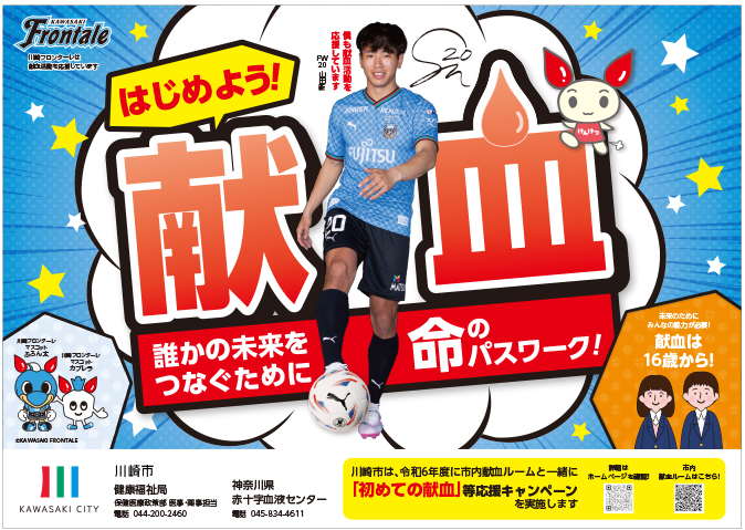 この度、川崎市健康福祉局が製作する川崎市内の「献血」推進ポスターに、当クラブの山田新選手が採用されましたので、お知らせいたします。