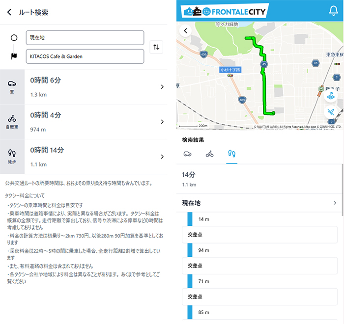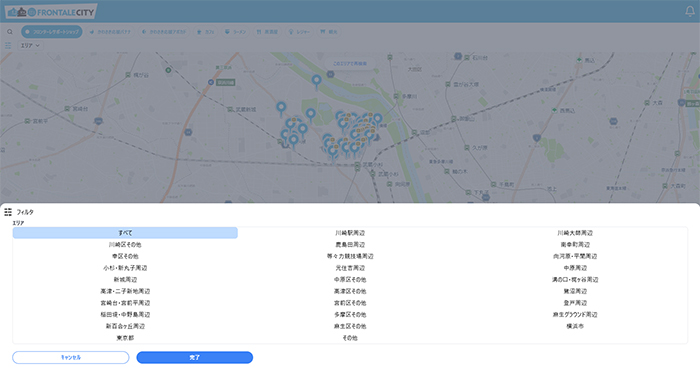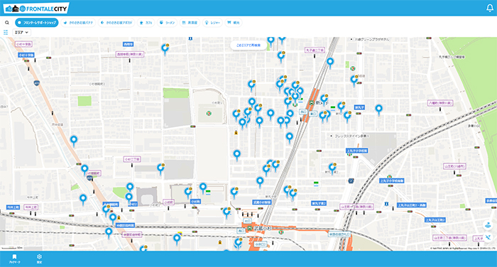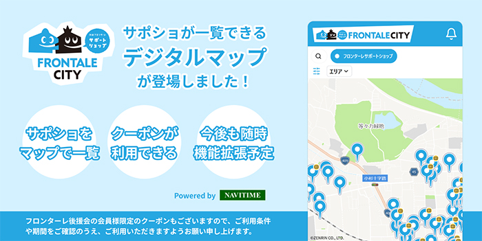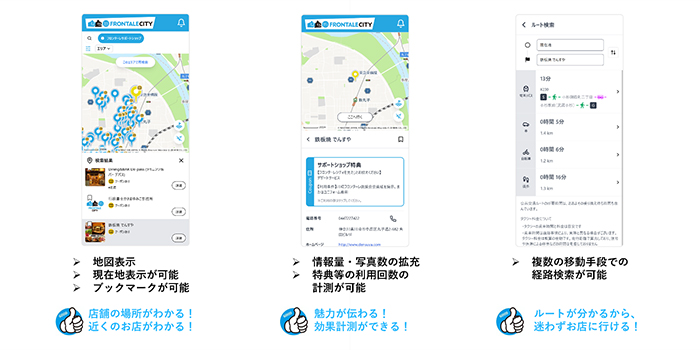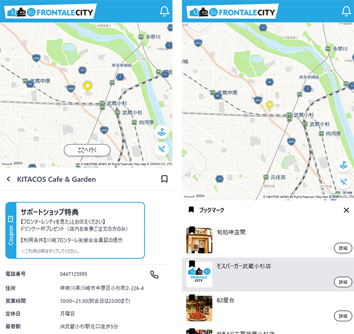 今回のリニューアルでは、より快適に「フロンターレシティ」をご利用いただけるよう、ナビタイムジャパンと連携し、デジタルマップ機能を追加しました。これにより、店舗検索がさらに便利になり、特典をご提供いただいている店舗も一目で確認できるようになります。また、ブックマーク機能を活用して、お気に入りの店舗を簡単に見つけることができ、位置情報を使えば指定した店舗までのルート検索も可能です。