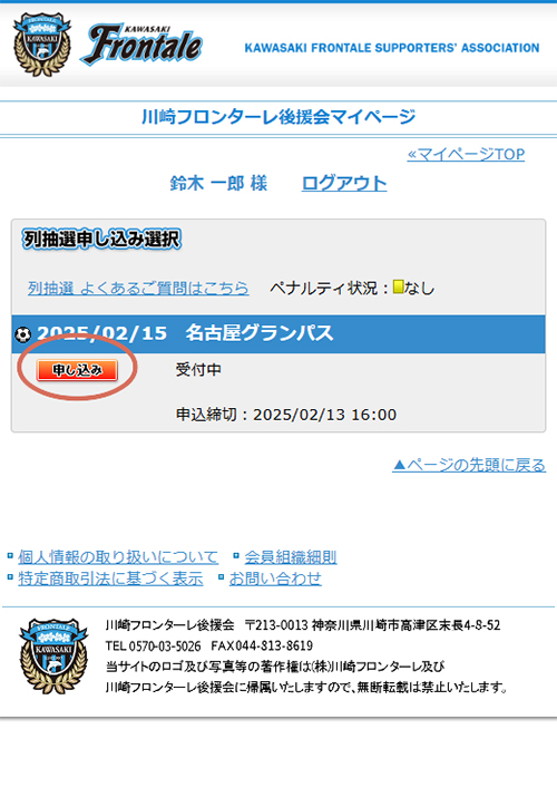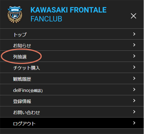 後援会マイページへログイン後、希望する試合の列抽選の申し込みをしてください。