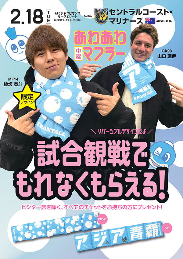 セントラルコースト・マリナーズ戦、ビジター席を除く来場者全員に「あわあわ中綿マフラー」をプレゼントいたします!