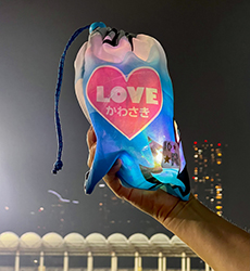 街をフロンターレ色に染めていたタペストリーを活用した、アップサイクルデザインのきんちゃくです。