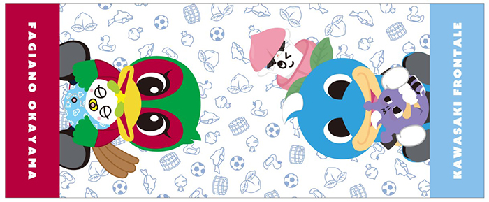 川崎フロンターレマスコットとファジアーノ岡山のファジ丸くんがデザインされたフェイスタオルです。