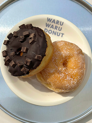 カカオ64%のビターチョコにチャンクチョコをたっぷりトッピングしたギルティーなドーナツと、生地の美味しさをダイレクトに感じられるシュガードーナツのベストコンビ‼ ◇RECOMMEND WARU SET:800円(限定100個)