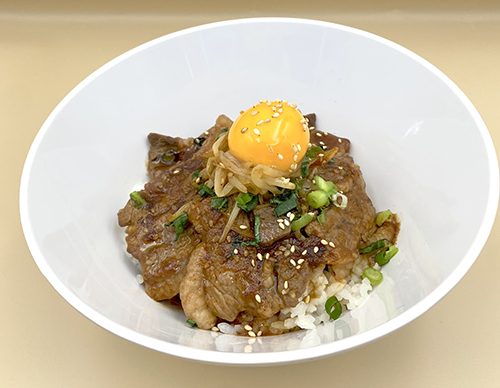 牛カルビを焼肉のタレで味付けしました。卵黄はお好みで崩して召し上がれ。