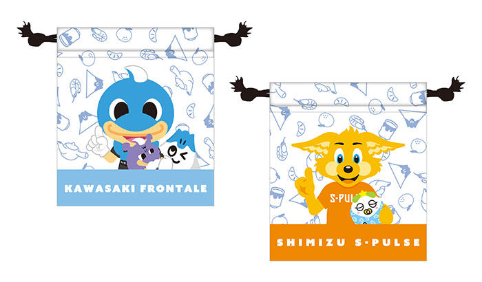川崎フロンターレマスコットと清水エスパルスのパルちゃんがデザインされた巾着です。