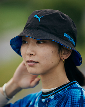 試合観戦はもちろんのこと、レジャーや日々のお買い物の場面など、シーンに合わせで着用でき、華やかな『FLOWER GAME SHIRTS』と同柄の面と黒のシンプルな面を持つリバーシブルハット。素材は軽量感のあるナイロンを使用。川崎フロンターレのクラブロゴからアレンジしたFLOWERロゴ、PUMAキャット、BEAMS SPORTSロゴを随所に配置しました。