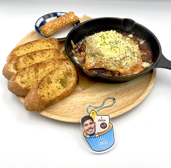 エリソン選手の好きな食べ物は“ラザニア”ということで、マッシュポテト・トマトソース・牛すじデミグラスソースに、2種類のチーズがたっぷりのラザニアをご用意しました。