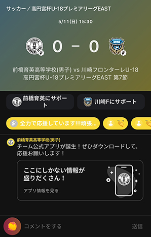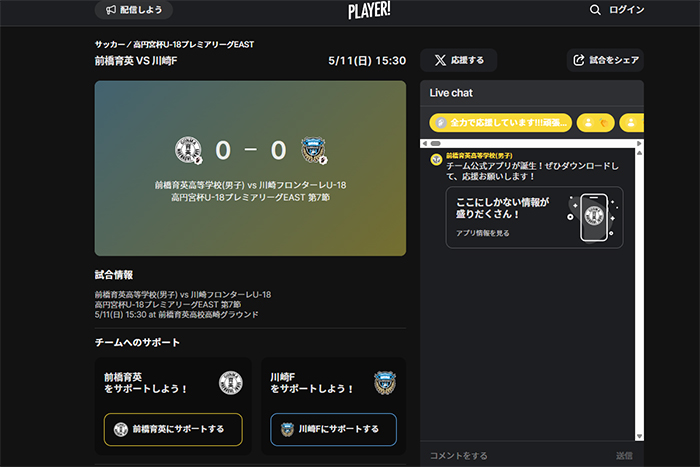 今シーズンもフロンターレアカデミーの選手たちの戦いぶりをタイムリーに皆さんにお届けするため、スポーツライブエンターテイメントアプリ「Player!」にて試合速報を実施します。