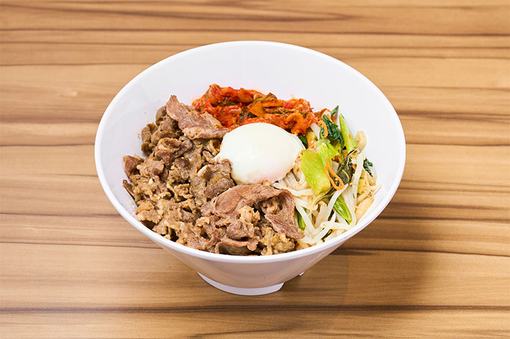 ビビンバ丼は、ごはん(炭水化物)、野菜(ビタミン・ミネラル)、肉(たんぱく質)、卵(たんぱく質と脂質)など、多様な食材が組み合わさった一品! 小松菜やもやしなどの食材は食物繊維を含み、腸内環境を整えるとともに、消化を助けてくれます!