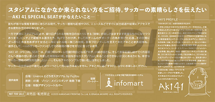 また、本企画は株式会社インフォマート様にご協賛いただき、家長昭博選手監修でさまざまな記念品をご用意します。6月25日(水)アルビレックス新潟戦は「インフォマートエキサイトマッチ」として、本招待シートにおいても特別な企画を行う予定です。