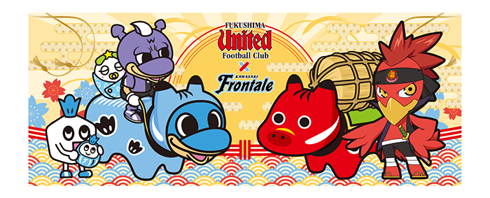 福島ユナイテッドFCのマスコット「福嶋 火之助」と川崎フロンターレのマスコットたちがコラボした、対戦記念の特製デザインです。お互い、地域を想う気持ちは誰よりも強く、チームを熱く応援するマスコット同士のコラボです!!