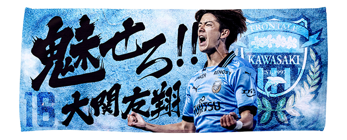 サポーターが選手へ向けて歌うチャント。想いを込めて作られたそのチャントで使用されているワードを使い、デザインされたフェイスタオルです。大関選手のチャントで使用されている“魅せろ”を大きくデザインしています。