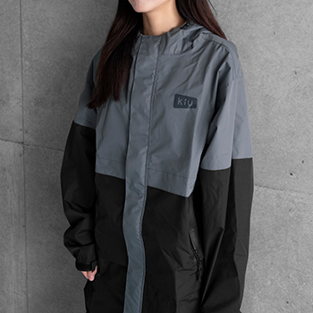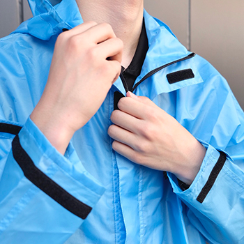 ダブルファスナー仕様なので気温に合わせて調整も簡単なレインウェアです。フード周り・袖口はぴったりフィットできるように調整でき、雨の侵入を防ぎます。