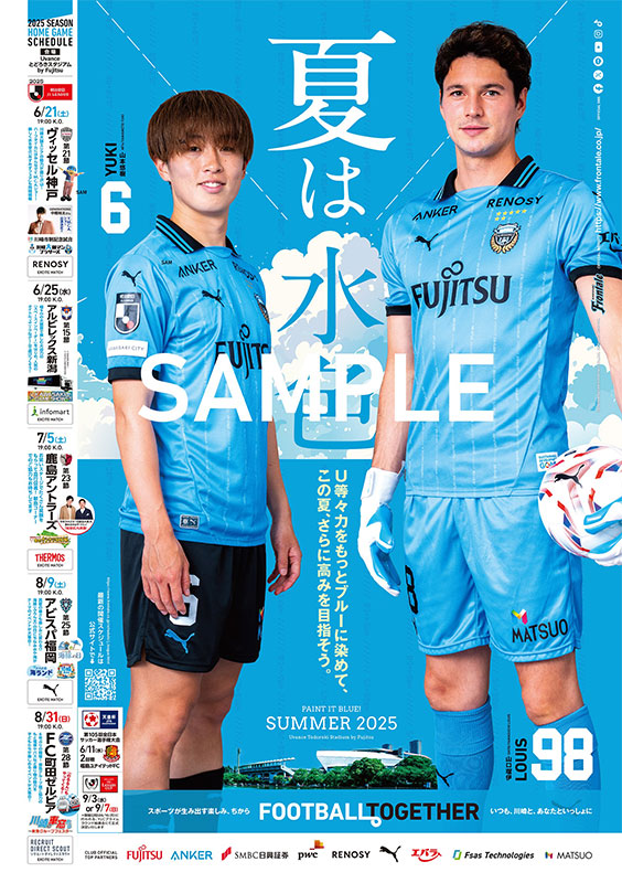 川崎市内の商店街やサポートショップの皆さんに掲示していただいている、ホームゲームの予定を伝える「スケジュールポスター」