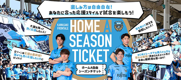 ◇「2025ホームA自由シーズンチケット」通年販売! 人気試合も確実に観戦可能!!川崎フロンターレでは、「2025ホームA自由シーズンチケット通年販売」を実施しています。チケット確保の心配がいらない「シーズンチケット」をぜひご購入ください!! |