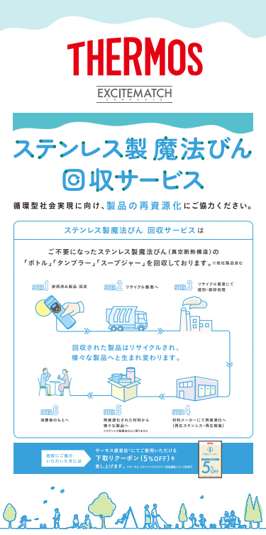 ステンレス製魔法びんの再資源化を目指し、サーモスブース内に「使用済みステンレス製魔法びん」の回収を行います。ご不要の「使用済みステンレス製魔法びん」をお持ち込みいただいたお客様には、川崎フロンターレ選手の限定オリジナルトレカとサーモス公式オンラインショップでステンレス製魔法びん購入時にご利用いただける「5%OFF 下取りクーポン」をお渡しします。