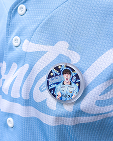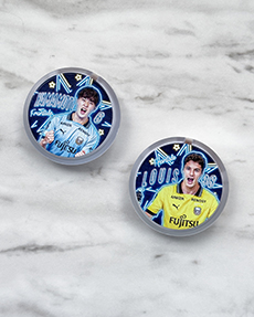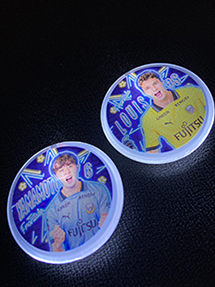 裏面のボタンで3パターンの光り方に変更することができます! また、裏面にはピンが付いているのでカバンなどに取り付けて楽しんでください。お気に入り選手を輝かせてアピールしましょう!!