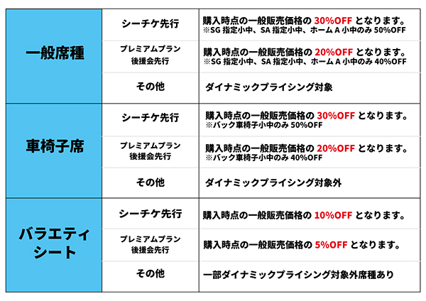 | 価格 | 各席種の販売価格×25%割引 ※ダイナミックプライシング対象、クラブ公式リセール対象 ※小中価格はございません。一律大人価格での販売となります。 |