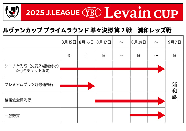 9月7日(日)に行われる2025 Jリーグ YBCルヴァンカップ プライムラウンド 準々決勝第2戦 浦和レッズ戦のチケット販売についてお知らせいたします。
