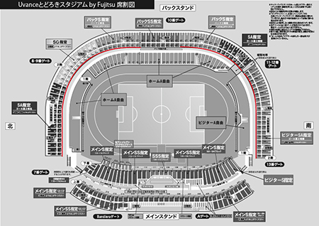 ゴール裏1階北、ゴール裏1階南については、座席のないエリアとなり、立見での観戦となります。