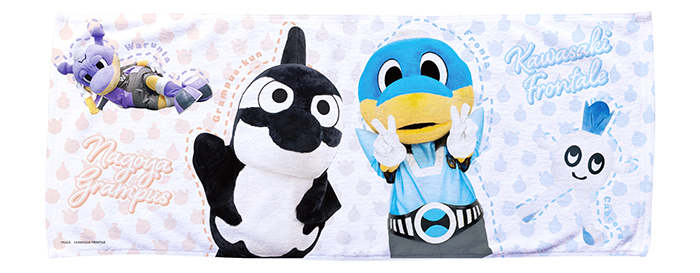 川崎フロンターレマスコットと名古屋グランパスマスコットのグランパスくんがデザインされたフェイスタオルになります。マスコット本来のかわいさがそのまま詰まった、ありそうでなかった実写デザインが登場です!