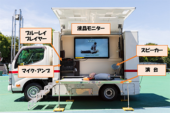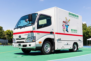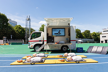 東京消防庁の応急救護普及車を使用して、胸骨圧迫とAED取り扱いを体験!