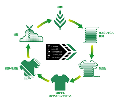 さらに、ピエクレックス繊維を使用したアパレル製品や繊維製品は、使い古した後、「P-FACTS」(ピーファクツ)という回収・堆肥化システムによって自然に還り、次の植物の栽培に再利用されます。
