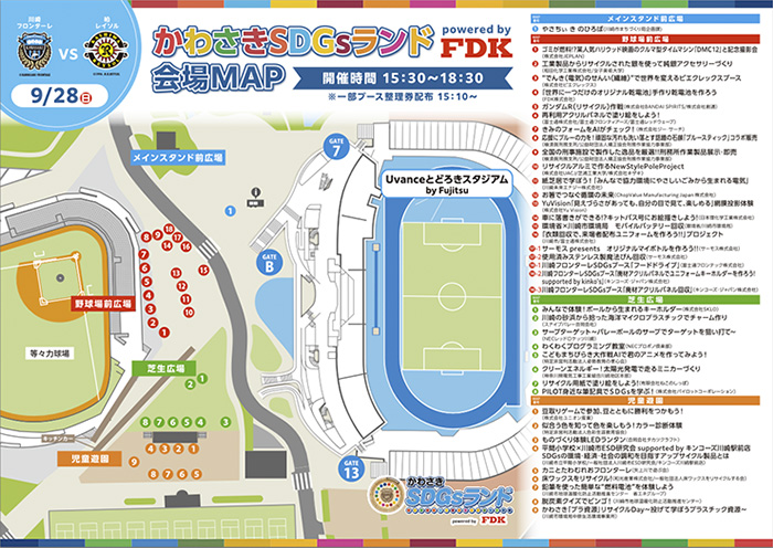 9月28日(日)柏レイソル戦では、川崎フロンターレも率先して推進しているSDGsを、みんなで楽しく遊べる、学べる、体験できるイベント「かわさきSDGsランドpowered by FDK」を開催いたします。