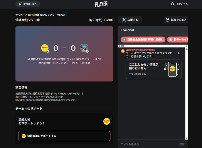 今シーズンもフロンターレアカデミーの選手たちの戦いぶりをタイムリーに皆さんにお届けするため、スポーツライブエンターテイメントアプリ「Player!」にて試合速報を実施します。