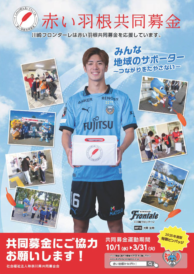 川崎フロンターレでは、社会福祉法人 神奈川県共同募金会が本年度に実施する「赤い羽根共同募金」の川崎市内で行う募金運動に関して、今年度も協力することになりましたのでお知らせいたします。