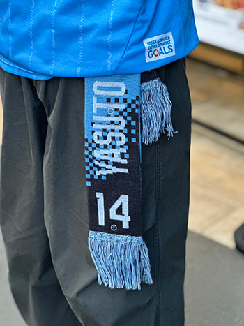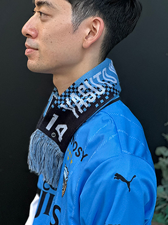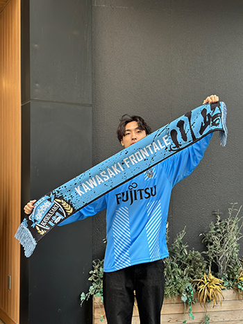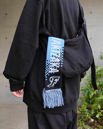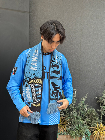 表裏のコントラストを活かして、巻いたり掲げたりと、スタジアムでの応援シーンで存在感を発揮しつつ、冬の防寒にも活躍する一枚です。エンブレムとFロゴが片面づつに入り、「川崎」の漢字がダイナミックな1枚に仕上がっています。