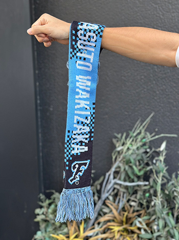 ホームゲーム勝利時限定で発売する限定デザインのタオルマフラー。青のラメ糸や星形のワッペンを使用した、勝利時限定の特別デザインです!