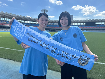 等々力に轟く「明日も」を原曲にしたチャントは、選手・スタッフのみならず、スタンドの多くのファン・サポーターの背中を大きく後押ししています。そんなチャントの歌詞をGt.Vo 宮崎朝子さんによる手描きデザイン!! “明日も”もちろん、“これからも”等々力にはこのチャントが轟き続ける。
