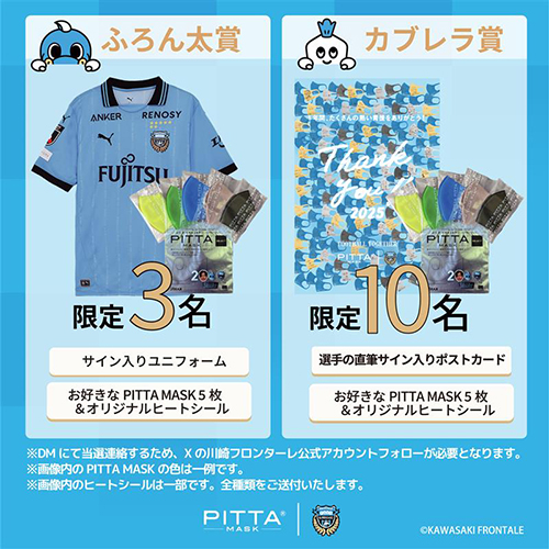 ◇豪華プレゼントが当たる! SNSキャンペーン実施CUSTOM! PITTAで作ったオリジナルマスクとPITTA POSTを一緒に撮影した写真をXに投稿すると、抽選で13名様に豪華賞品をプレゼント! ・応募期間11月30日(日)~12月14日(日) ・応募手順①PITTA MASKブースに参加! 当選者には、Xの川崎フロンターレ公式アカウント(@frontale_staff)からDMでご連絡します ・賞品ふろん太賞(3名):サイン入りユニフォーム・お好きなPITTA MASK 5枚&オリジナルヒートシール