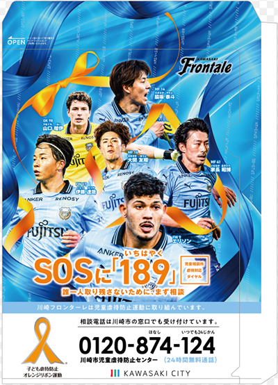 | 内容 | 川崎フロンターレでは、市民の皆さんと一緒に子ども虐待を減らしていくことを目的として、少しでも多くの方に興味を持っていただくため、川崎市による児童虐待防止の啓発活動に協力しています。