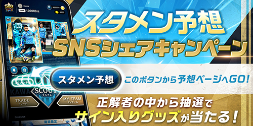 | 内容 | 11月30日(日)開催の明治安田J1リーグ第37節 サンフレッチェ広島戦のスターティングメンバーを予想し、見事的中した方の中から抽選で3名様にサイン入りグッズをプレゼント!