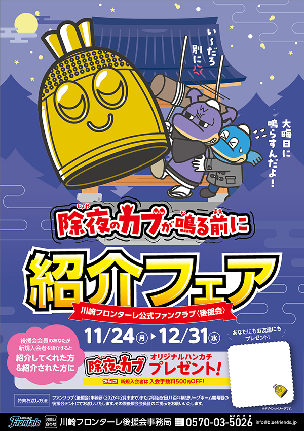 川崎フロンターレ 公式ファンクラブ〈後援会〉では、新たにファンクラブ〈後援会〉に入会する方をご紹介いただくと、紹介者・入会者ともに特典がもらえる紹介フェアを実施いたします。