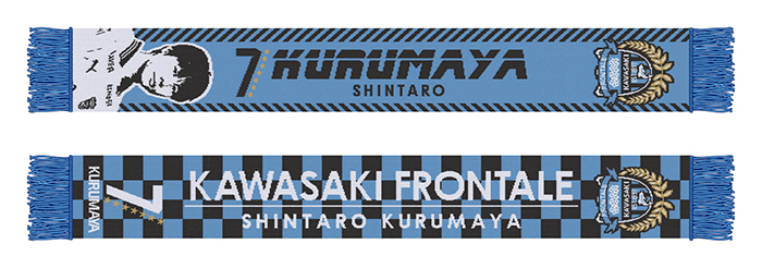 サッカーの定番グッズとなるニットマフラー。シンタロウの写真を入れ込んだ特製デザインになります。表の上下には車のタイヤ跡をイメージし、裏にはチェッカーフラッグをイメージしたデザインに仕上がりました。
