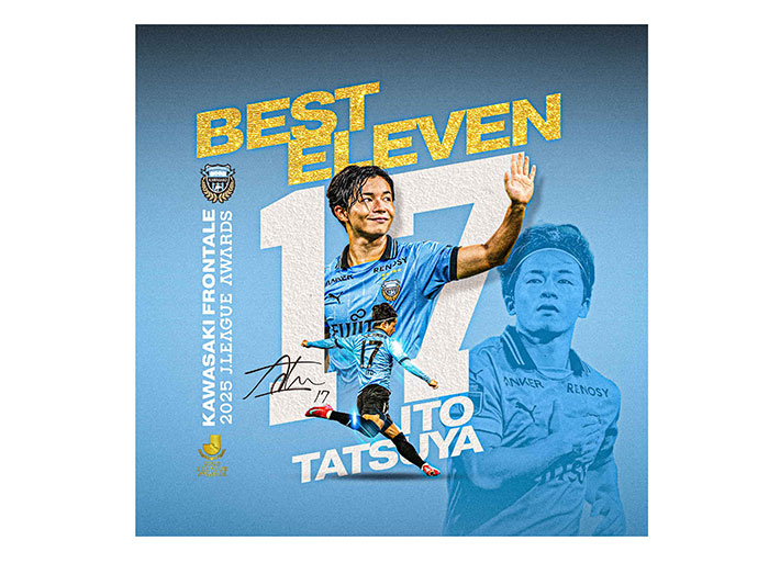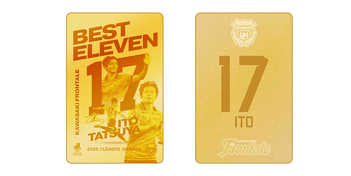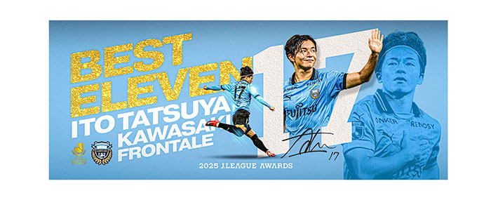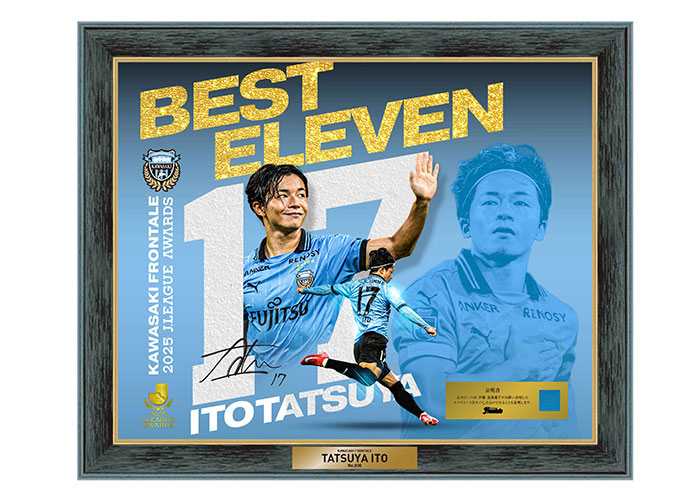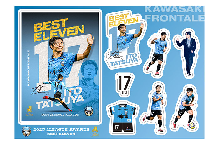川崎フロンターレでは、12月11日(木)に開催されました「2025Jリーグアウォーズ」にて伊藤達哉選手がベストイレブンに選出されたことを記念して、伊藤達哉選手「2025 MEIJI YASUDA J.LEAGUEベストイレブンメモリアルグッズ」を川崎フロンターレオフィシャルWEBショップにて販売いたしますので、お知らせいたします。
