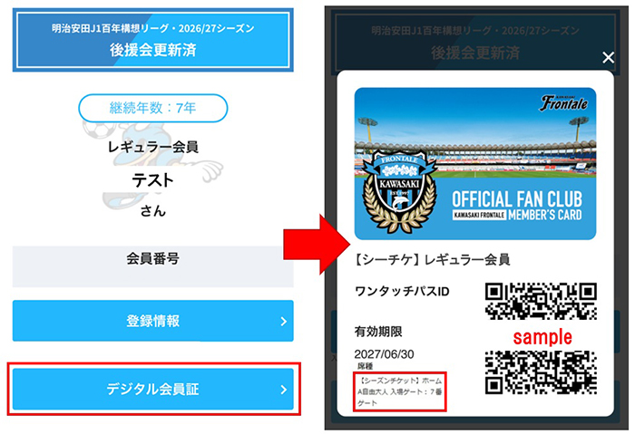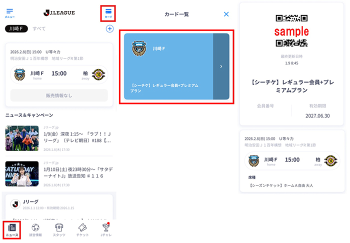 A. Jリーグ公式アプリ「Club J.LEAGUE」内の「ニュース」画面の右上に表示される「カード」から「川崎F」のカードを選択してご確認いただくか、後援会マイページトップ画面の「デジタル会員証」よりご確認ください。