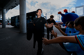 会場に到着した選手バスを間近で出迎え、選手とハイタッチをするお子様を募集します。