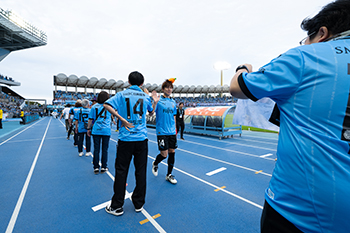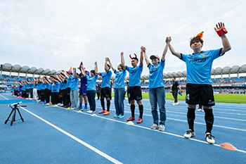 川崎フロンターレが勝利時、試合直後にピッチ横トラック上にて、選手とハイタッチをし、共に万歳三唱をします。