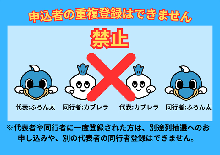 ・代表者や同行者に一度登録された方は、別途、列抽選へのお申し込みや別の代表者への同行者登録はできません。