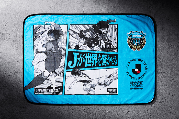 ブランケットのデザインには、日本が世界に誇るサッカー漫画『キャプテン翼』をはじめ、近年国内外で絶大な人気を誇る『ブルーロック』『アオアシ』の三つの作品とのコラボレーションが実現しました。シーズン移行という大きな転換点を経て、Jリーグが今後さらに成長し、世界を驚かせるという意思を、3作品の主人公が放つ力強いシュートと重ね合わせ、メッセージとして発信していきます。
